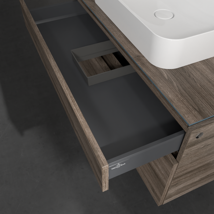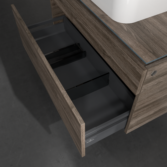 Практичні внутрішні перегородки. Продумані внутрішні перегородки в меблях для ванної кімнати Villeroy & Boch дозволяють індивідуально підтримувати порядок у ваннійкімнаті. Різні елементи, такі як регульовані скляні перегородки та ящики для різних розмірів аксесуарів, забезпечують порядок і хороший огляд.