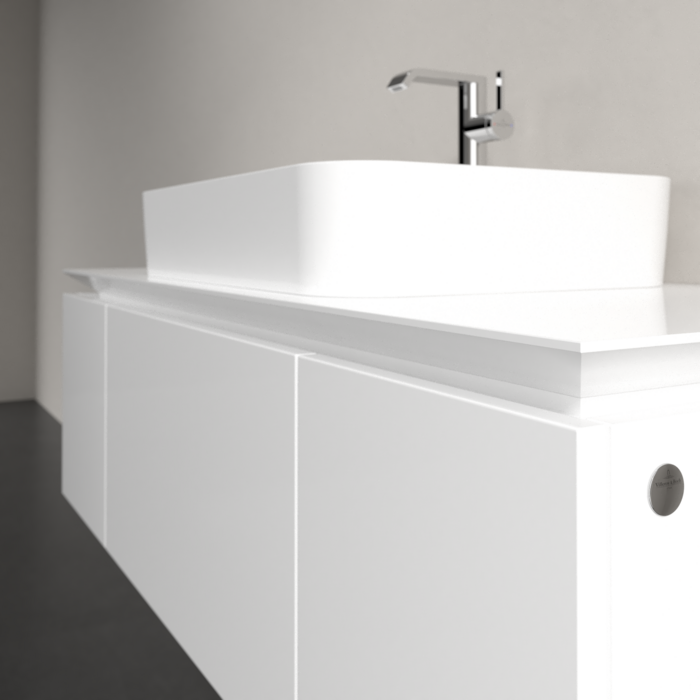 Legato — це комплексна колекція для ванних кімнат у лаконічному та елегантному стилі, яка відповідає найвимогливішим вимогам. Прямі лінії виробів із кераміки ідеально доповнюють виразний дизайн меблів цієї успішної колекції. Завдяки вишуканим деталям, таким як опціональне вбудоване світлодіодне освітлення з регульованою яскравістю та скошені краї, тумби під раковину для накладного монтажу здаються ширяючими.