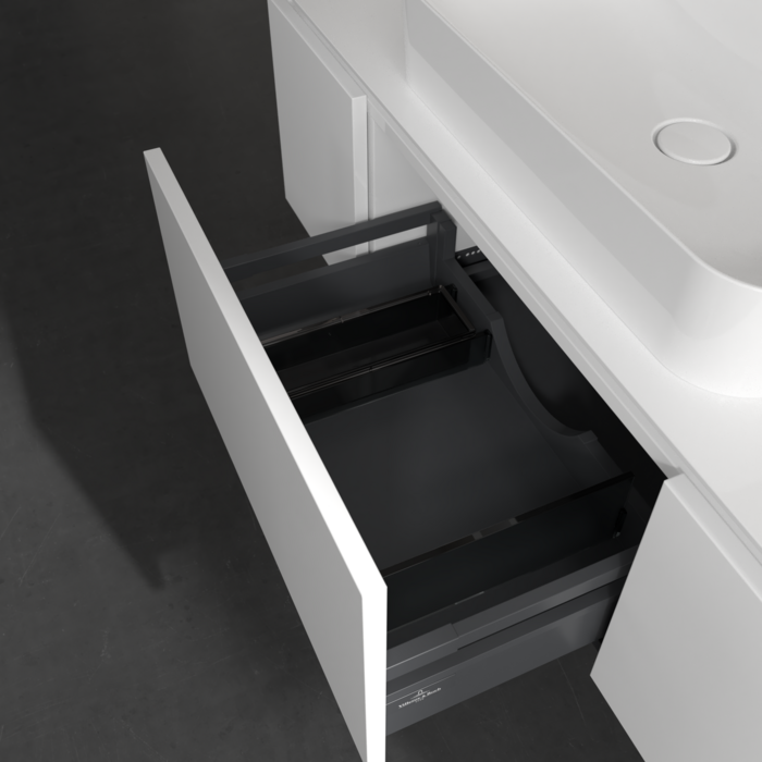 Практичні внутрішні перегородки. Продумані внутрішні перегородки у меблях для ванної кімнати Villeroy & Boch дозволяють індивідуально підтримуватипорядок у ванній кімнаті. Різні елементи, такі як регульовані скляні перегородки та ящики для різних розмірів аксесуарів, забезпечують порядок і хороший огляд.
