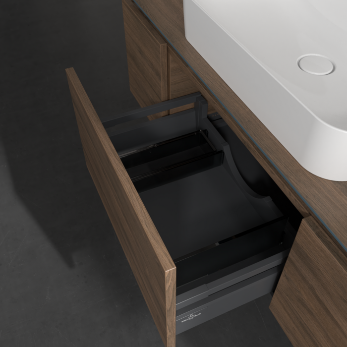 Практичні внутрішні перегородки. Продумані внутрішні перегородки в меблях для ванної кімнати Villeroy & Boch дозволяють індивідуально підтримувати порядок у ваннійкімнаті. Різні елементи, такі як регульовані скляні перегородки та ящики для різних розмірів аксесуарів, забезпечують порядок і хороший огляд.