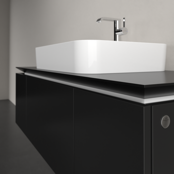 Legato — це комплексна колекція для ванних кімнат у лаконічному та елегантному стилі, яка відповідає найвимогливішим вимогам. Прямі лінії виробів із кераміки ідеально доповнюють виразний дизайн меблів цієї успішної колекції. Завдяки вишуканим деталям, таким як опціональне вбудоване світлодіодне освітлення з регульованою яскравістю та скошені краї, тумби під раковину для накладного монтажу здаються ширяючими.
