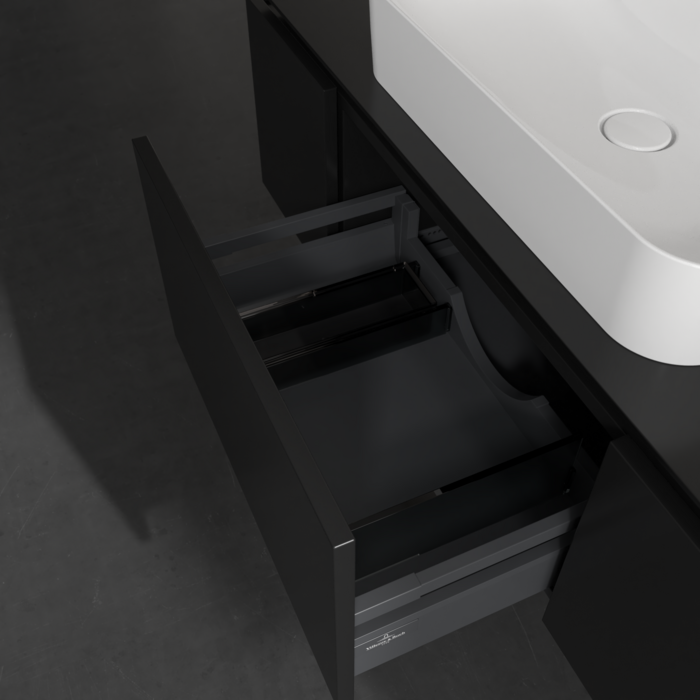 Повне висування. Завдяки функції повного висування висувні ящики можна повністю висувати. Весь їхній вміст добре видно і його зручно діставати. Більше не потрібно копатися в далеких відсіках висувної шухляди — завдяки меблям для ванни з повним висуванням ви отримуєте повний огляд.