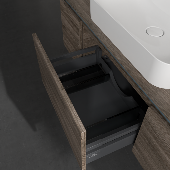 Практичні внутрішні перегородки. Продумані внутрішні перегородки в меблях для ванної кімнати Villeroy & Boch дозволяють індивідуально підтримувати порядок у ваннійкімнаті. Різні елементи, такі як регульовані скляні перегородки та ящики для різних розмірів аксесуарів, забезпечують порядок і хороший огляд.