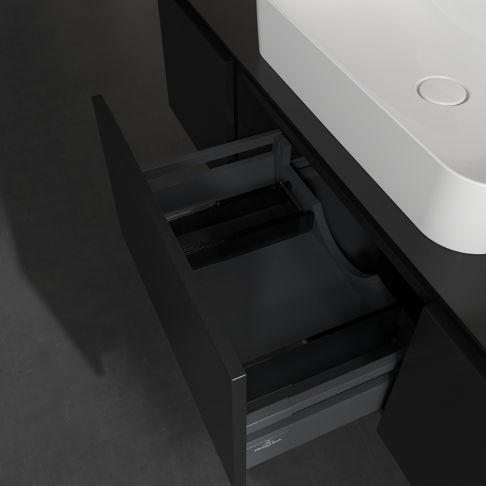 Практичні внутрішні перегородки. Продумані внутрішні перегородки у меблях для ванної кімнати Villeroy & Boch дозволяють індивідуально підтримуватипорядок у ванній кімнаті. Різні елементи, такі як регульовані скляні перегородки та ящики для різних розмірів аксесуарів, забезпечують порядок і хороший огляд.
