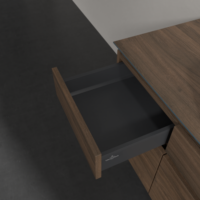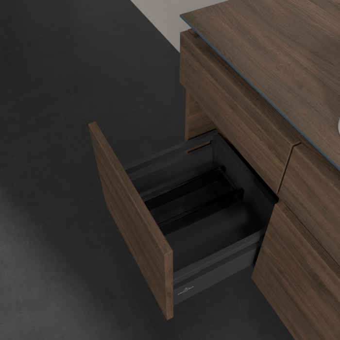 Практичні внутрішні перегородки. Продумані внутрішні перегородки в меблях для ванної кімнати Villeroy & Boch дозволяють індивідуально підтримувати порядок у ваннійкімнаті. Різні елементи, такі як регульовані скляні перегородки та ящики для різних розмірів аксесуарів, забезпечують порядок і хороший огляд.