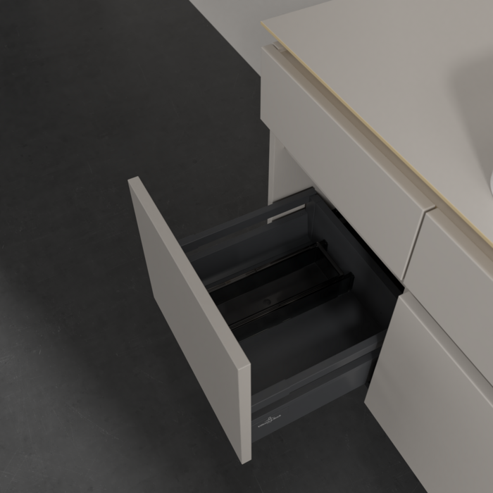 Практичні внутрішні перегородки. Продумані внутрішні перегородки в меблях для ванної кімнати Villeroy & Boch дозволяють індивідуально підтримувати порядок у ваннійкімнаті. Різні елементи, такі як регульовані скляні перегородки та ящики для різних розмірів аксесуарів, забезпечують порядок і хороший огляд.