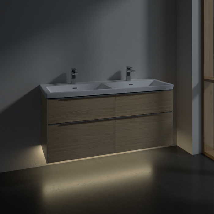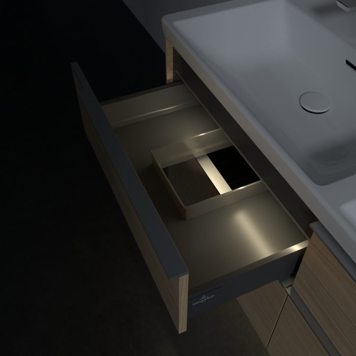 Підсвічування з плавним регулюванням світла для меблів для ванної. Завдяки меблів для ванної з вбудованим підсвічуванням Villeroy & Boch у вас у будь-якій ситуації буде правильне світло. Підсвічування зенергозберігаючими світлодіодними лампами та плавним регулюванням світла може змінюватися за допомогою дистанційного керування від холодного до теплого білого світла. Вишукані елементи підсвічування створюють відповідний настрій у ванній кімнаті.