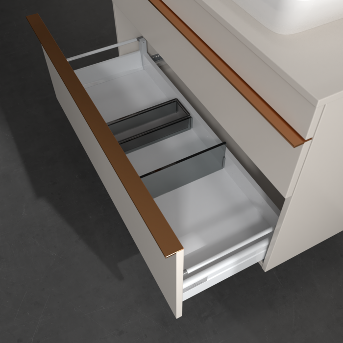 Продуманий внутрішній поділ меблів для ванної кімнати Villeroy & Boch дозволяє створити індивідуальнусистему організації простору у ванній кімнаті. Елементи, розташування яких можна змінювати, наприклад, регульовані скляні перегородки та контейнери для аксесуарів різних розмірів, забезпечують хороший огляд та порядок. Завдяки практичній системі внутрішнього поділу ви швидко знаходитимете приладдя для ванної, якими ви постійно користуєтеся.