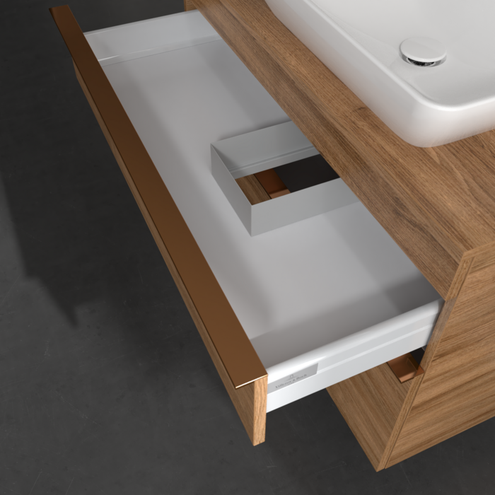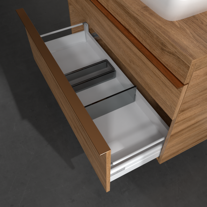 Продуманий внутрішній поділ меблів для ванної кімнати Villeroy & Boch дозволяє створити індивідуальнусистему організації простору у ванній кімнаті. Елементи, розташування яких можна змінювати, наприклад, регульовані скляні перегородки та контейнери для аксесуарів різних розмірів, забезпечують хороший огляд та порядок. Завдяки практичній системі внутрішнього поділу ви швидко знаходитимете приладдя для ванної, якими ви постійно користуєтеся.