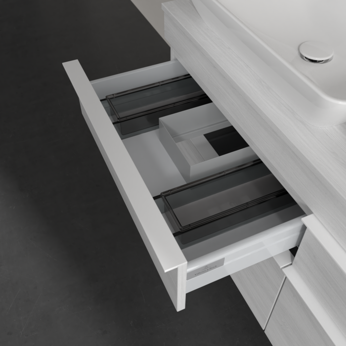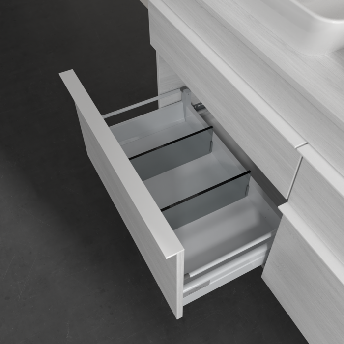 Продуманий внутрішній поділ меблів для ванної кімнати Villeroy & Boch дозволяє створитиіндивідуальну систему організації простору у ванній кімнаті. Елементи, розташування яких можна змінювати, наприклад, регульовані скляні перегородки та контейнери для аксесуарів різних розмірів, забезпечують хороший огляд та порядок. Завдяки практичній системі внутрішнього поділу ви швидко знаходитимете приладдя для ванної, якими ви постійно користуєтеся.