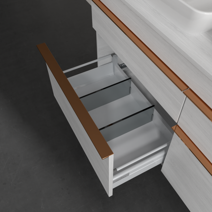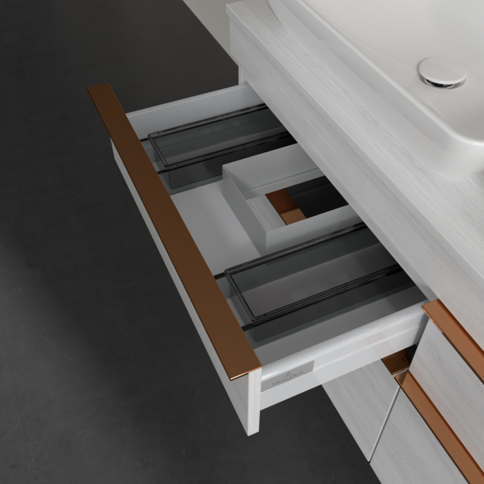 Продуманий внутрішній поділ меблів для ванної кімнати Villeroy & Boch дозволяє створити індивідуальнусистему організації простору у ванній кімнаті. Елементи, розташування яких можна змінювати, наприклад, регульовані скляні перегородки та контейнери для аксесуарів різних розмірів, забезпечують хороший огляд та порядок. Завдяки практичній системі внутрішнього поділу ви швидко знаходитимете приладдя для ванної, якими ви постійно користуєтеся.