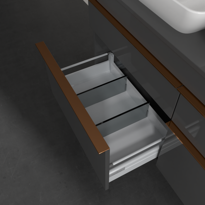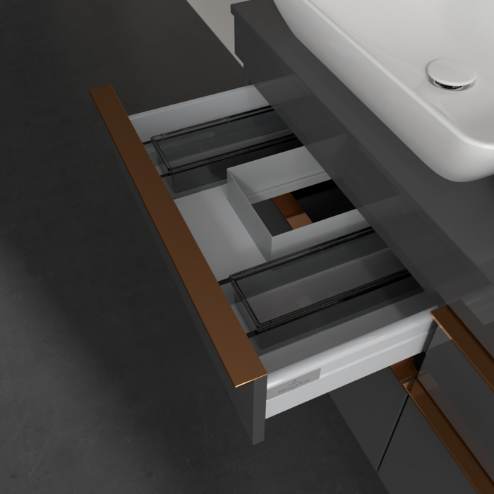 Продуманий внутрішній поділ меблів для ванної кімнати Villeroy & Boch дозволяє створити індивідуальнусистему організації простору у ванній кімнаті. Елементи, розташування яких можна змінювати, наприклад, регульовані скляні перегородки та контейнери для аксесуарів різних розмірів, забезпечують хороший огляд та порядок. Завдяки практичній системі внутрішнього поділу ви швидко знаходитимете приладдя для ванної, якими ви постійно користуєтеся.