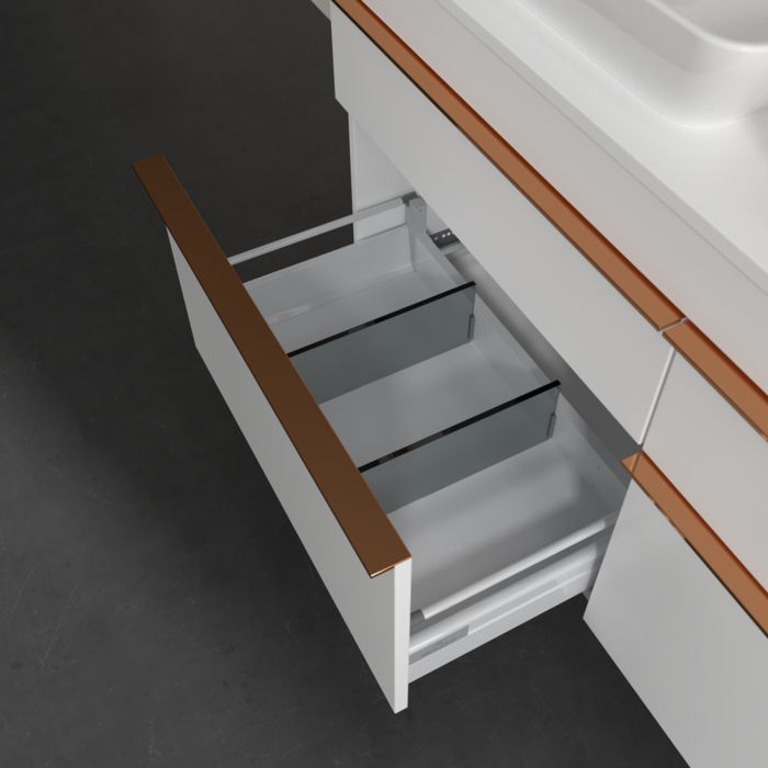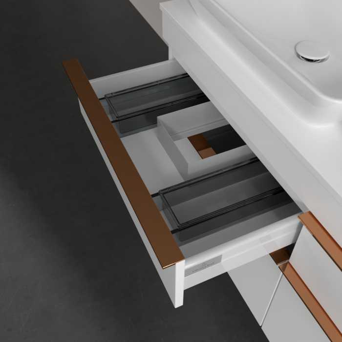 Продуманий внутрішній поділ меблів для ванної кімнати Villeroy & Boch дозволяє створитиіндивідуальну систему організації простору у ванній кімнаті. Елементи, розташування яких можна змінювати, наприклад, регульовані скляні перегородки та контейнери для аксесуарів різних розмірів, забезпечують хороший огляд та порядок. Завдяки практичній системі внутрішнього поділу ви швидко знаходитимете приладдя для ванної, якими ви постійно користуєтеся.