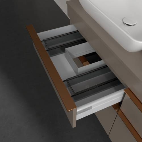 Продуманий внутрішній поділ меблів для ванної кімнати Villeroy & Boch дозволяє створити індивідуальну систему організації простору у ванній кімнаті. Елементи, розташування яких можна змінювати, наприклад, регульовані скляні перегородки та контейнери для аксесуарів різних розмірів, забезпечують хороший огляд та порядок. Завдяки практичній системі внутрішнього поділу ви швидко знаходитимете приладдя для ванної, якими ви постійно користуєтеся.