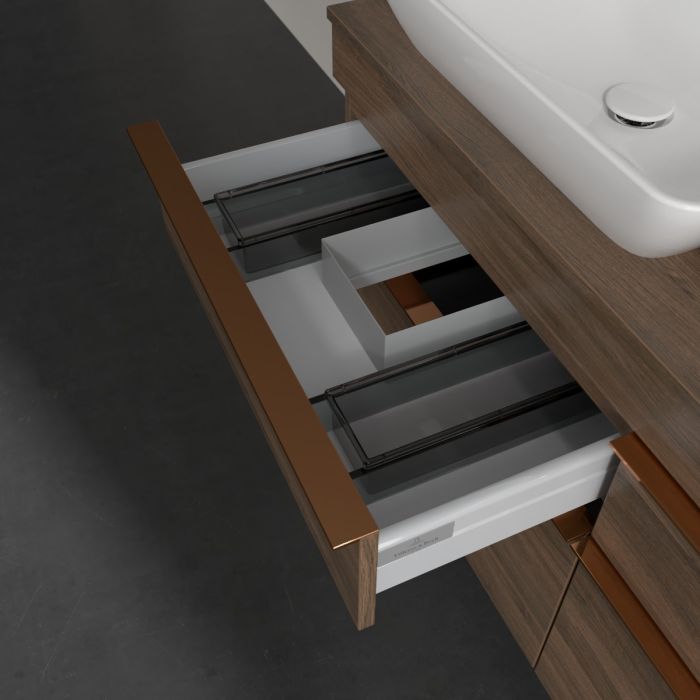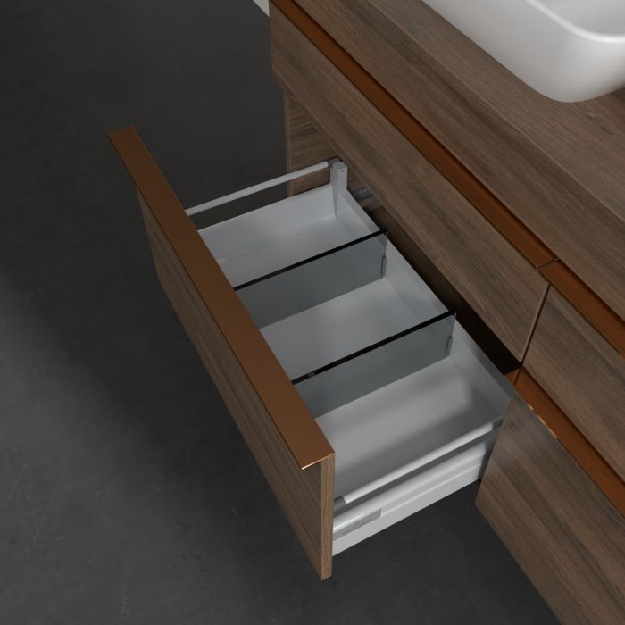 Продуманий внутрішній поділ меблів для ванної кімнати Villeroy & Boch дозволяє створити індивідуальну систему організації простору у ванній кімнаті. Елементи, розташування яких можна змінювати, наприклад, регульовані скляні перегородки та контейнери для аксесуарів різних розмірів, забезпечують хороший огляд та порядок. Завдяки практичній системі внутрішнього поділу ви швидко знаходитимете приладдя для ванної, якими ви постійно користуєтеся.