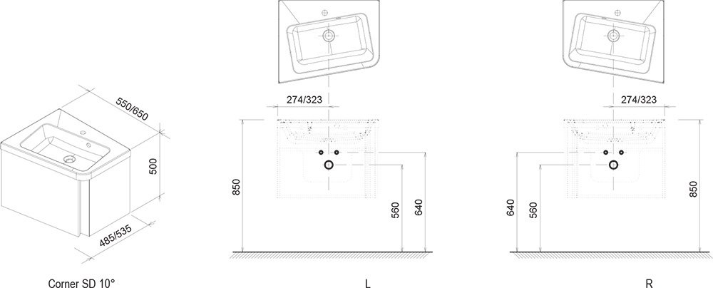 Стиль, що доповнює незвичайні форми кутового умивальника 10 °, легкий поворот якого забезпечує набагато більше простору в кутку ванної кімнати. Шафка пропонує об'ємне внутрішній простір і практичний ящик для зберігання дрібних речей. Три види декору (білий глянець, сірий глянець і темно-горіховий) дозволяють перетворити ванну кімнату і подарувати їй бажаний образ.