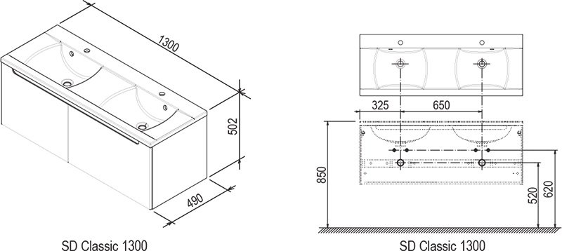 Шафка з двома високими ящиками з простором для речей висотою 40 см. У правій частині шафки є вбудований низький шухляда, в лівій частині - високий ящик з простором для речей висотою 40 см. В той же час просвердлені отвори для додаткового монтажу низького ящика , який можна докупити окремо або вільно переставити з правій частині в ліву. Дверцята представлені в білому глянцевому кольорі, корпус ж відповідно до обраної колірної комбінації. Поставляється в зібраному вигляді. У комплектацію виробивходить монтажний набір (болти, петлі, заглушки). Шафка встановлюється прямо на стіну, не можна використовувати регульовані ніжки MR Base. Для цілісного рішення і узгодженого дизайну ванної кімнати рекомендуємо шафка під подвійний умивальник комбінувати з іншими виробами концепції Classic (подвійним умивальником Classic 1300) та іншою продукцією RAVAK.
