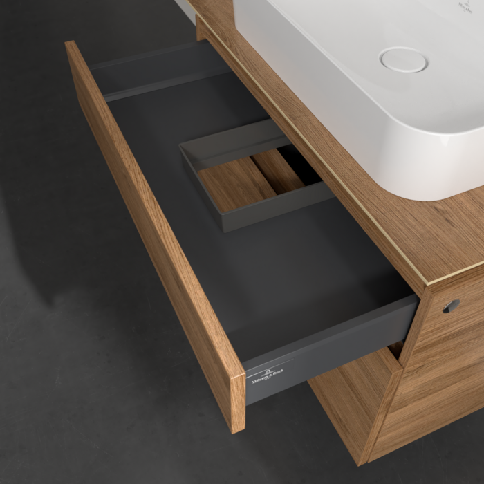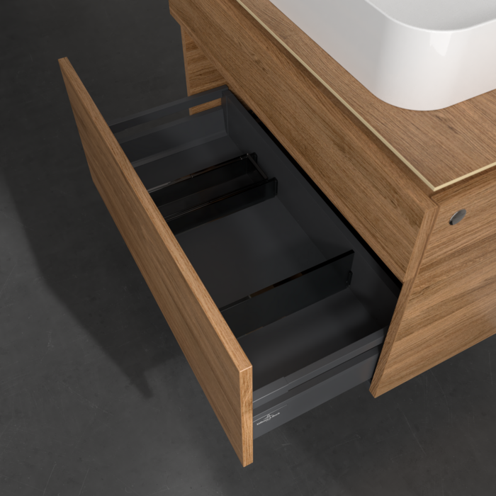 Практичні внутрішні перегородки. Продумані внутрішні перегородки в меблях для ванної кімнати Villeroy & Boch дозволяють індивідуально підтримувати порядок у ваннійкімнаті. Різні елементи, такі як регульовані скляні перегородки та ящики для різних розмірів аксесуарів, забезпечують порядок і хороший огляд.