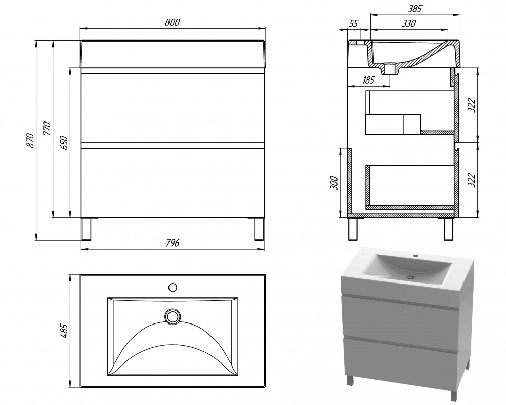 Розміри тумби (ш*г*в): 800х485х770 мм + ніжки 100 мм