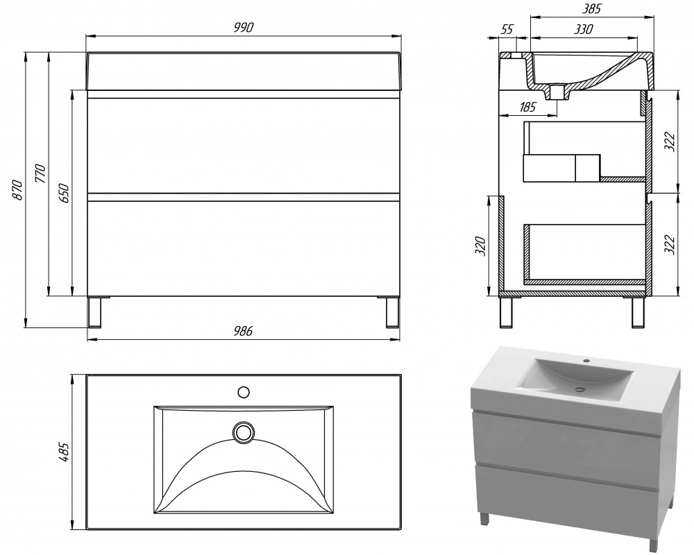 Розміри тумби (ш*г*в): 990х485х770 мм + ніжки 100 мм