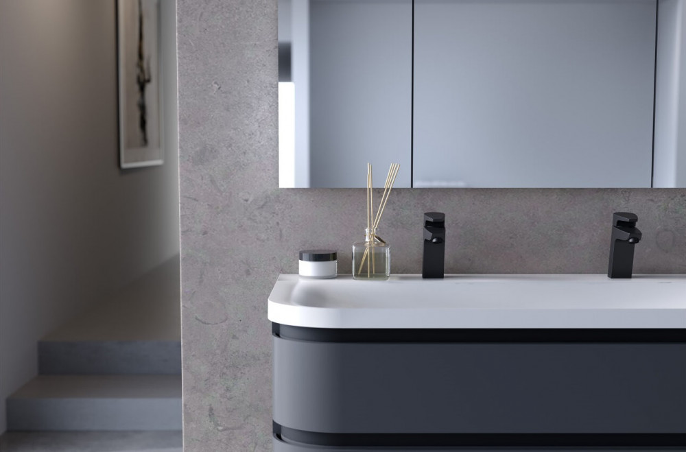Vittoria представлена у трьох одноколірних декорах – білому, бежевому та темному. Відчуття гламуру додатково підкреслюється лакованими лицьовими сторонами елементів. Для більш просторих ванних кімнат пропонуємо шафиподвійна ширина з м'яким закриттям, стильно доповнена частково інтегрованими ручками.