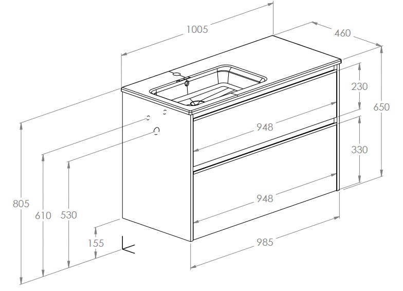 верхній ящик з вирізом під сифон, тумба без ручок (ручки можна купити окремо), ящики з повним висуванням та безшумним закриванням