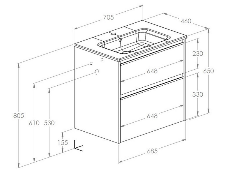 верхній ящик з вирізом під сифон, тумба без ручок (ручки можна купити окремо), ящики з повним висуванням та безшумним закриванням