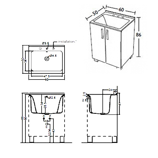 - Раковина пральня 60х50 см (намічено 2 отвори) і з отвором переливу