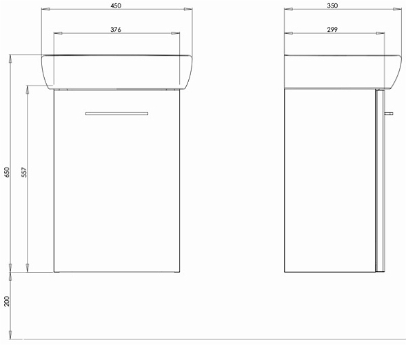 Складається з: Умивальник прямокутний, з отвором, 45 x 35 см + шафка під умивальник 37,6 x 55,7 x 29,9 см, колір: сірий ясен. Двері із механізмом soft-close. 1 нерегульована полиця із ДСП. Можливість встановлення з ніжками. У комплекті: монтажний набір, інструкція монтажу, ручка.