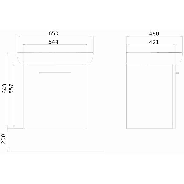 Складається з: Умивальник прямокутний, з отвором, 65 x 48 cм + шафка під умивальник 54,4 x 55,7 x 42,1 см, колір: білий глянець. Двері із механізмом soft-close. 1 нерегульована полиця з ДСП, металева полиця органайзер для пляшок на внутрішній стороні дверей (можливість регулювання висоти установки). Можливість встановлення з ніжками. У комплекті: монтажний набір, інструкція монтажу, ручка.