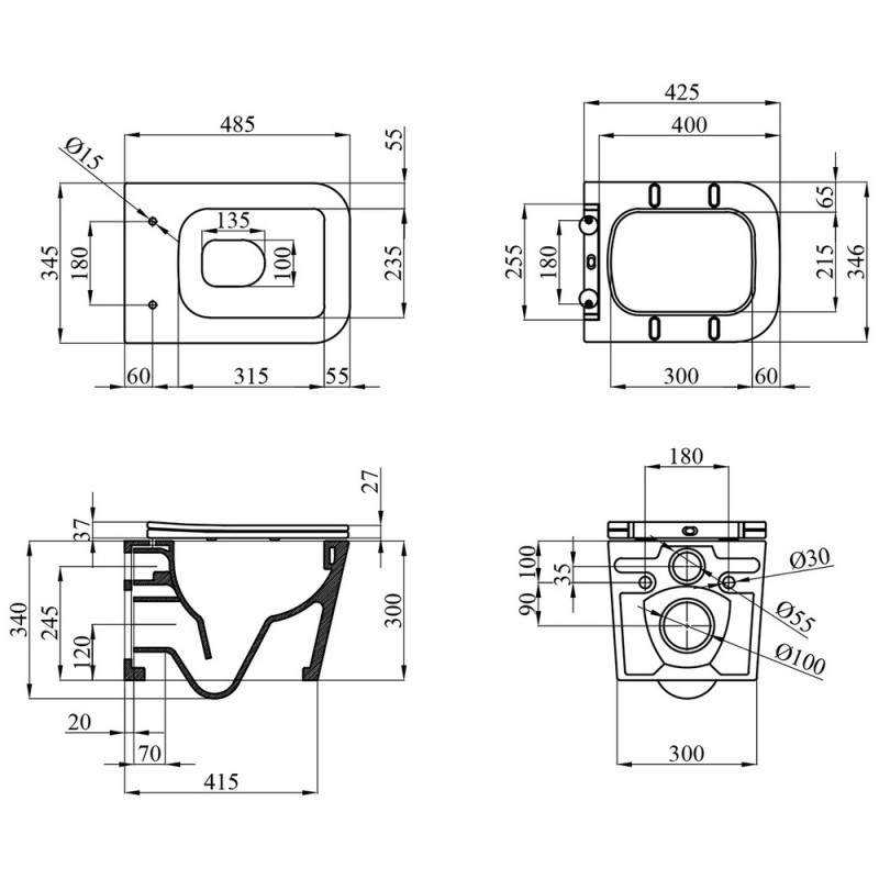 Унітаз виготовлений з непористого фаянсу, що робить його стійким до бруду та неприємних запахів, що полегшує очищення. Розміри відповідають кресленню з можливими відхиленнями ±2%. Можлива нерівність поверхні зумовлена технологією сушіння.