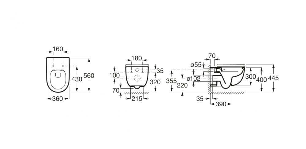 1) Унітаз підвісний Roca Meridian Rimless 36х56 см кераміка білий