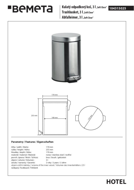 Відро для сміття Bemeta Hotel 3 л нержавіюча сталь хром матовий 104315025
