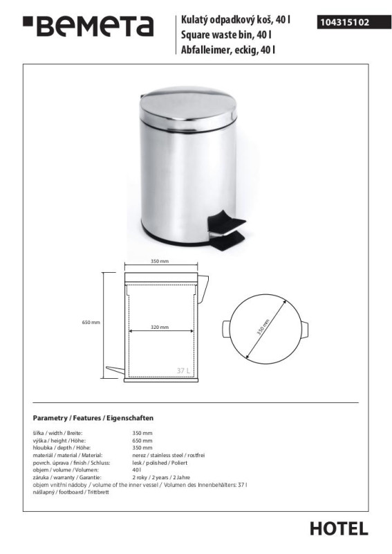 Відро для сміття Bemeta Hotel 40 л нержавіюча сталь хром 104315102