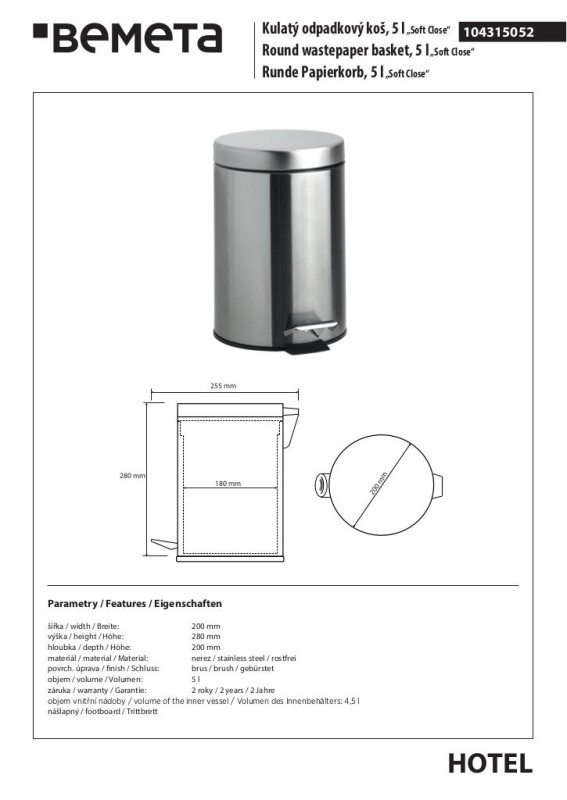 Відро для сміття Bemeta Hotel 5 л нержавіюча сталь хром матовий 104315052