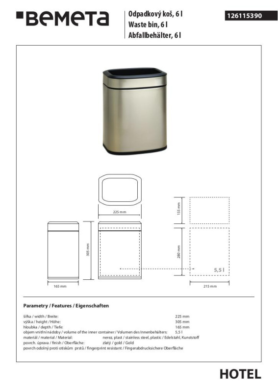 Відро для сміття Bemeta Hotel 6 л нержавіюча сталь золотий 126115390