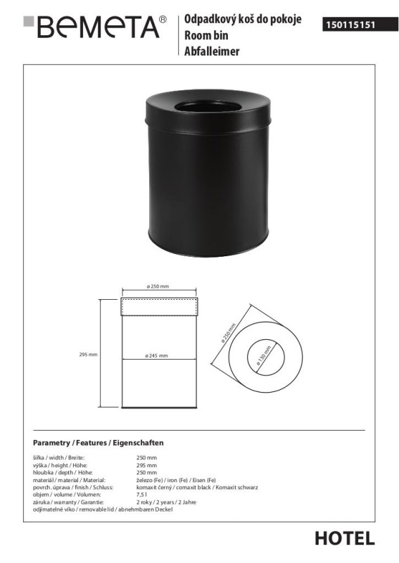 Відро для сміття Bemeta Hotel 7,5л нержавіюча сталь чорний мат 150115151