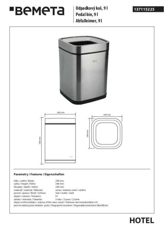 Відро для сміття Bemeta Hotel 9 л нержавіюча сталь хром матовий 137115225