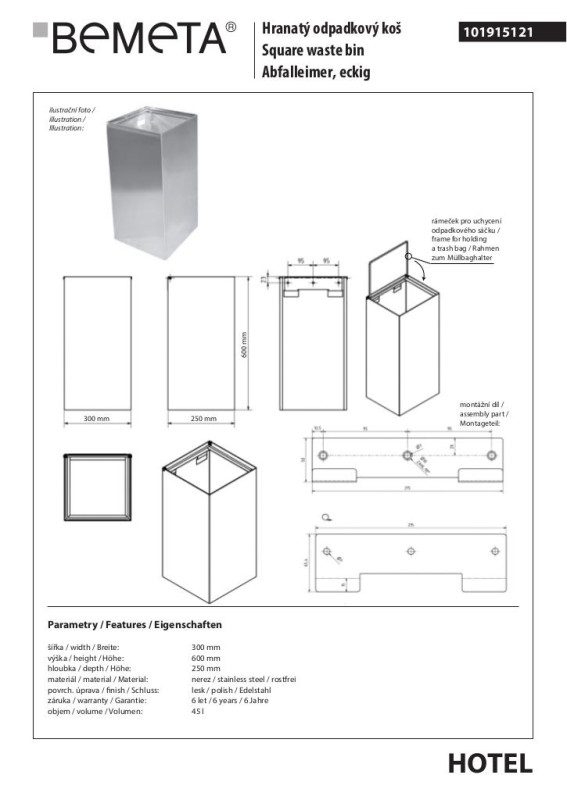Відро для сміття Bemeta Hotel настінне 45 л нержавіюча сталь хром 101915121