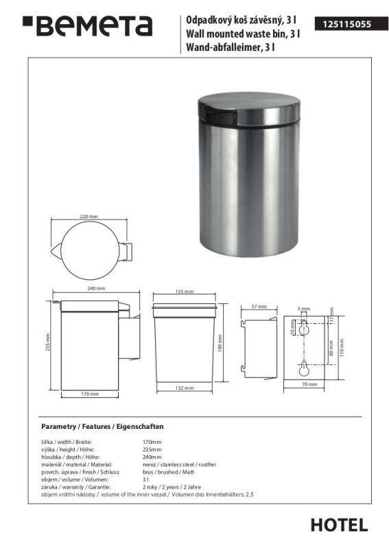 Відро для сміття Bemeta Hotel настінне 3 л нержавіюча сталь хром матовий 125115055