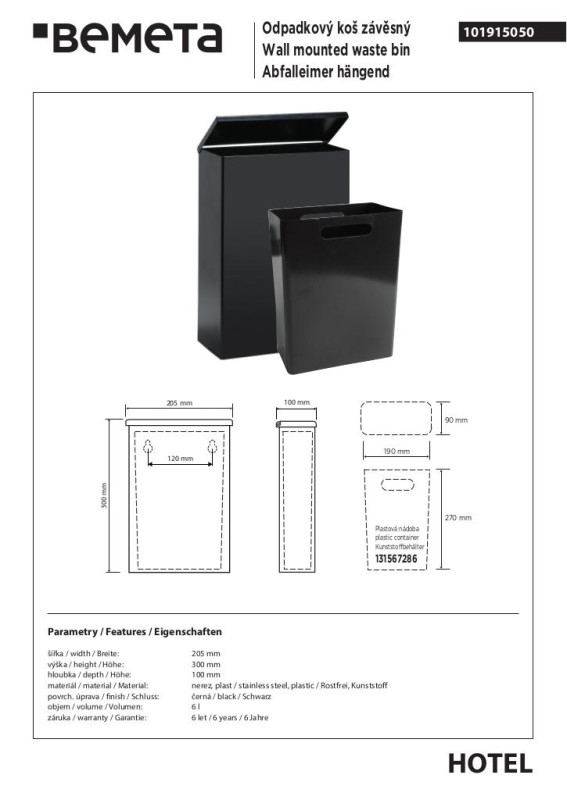 Відро для сміття Bemeta Hotel настінне 6 л нержавіюча сталь чорний мат 101915050