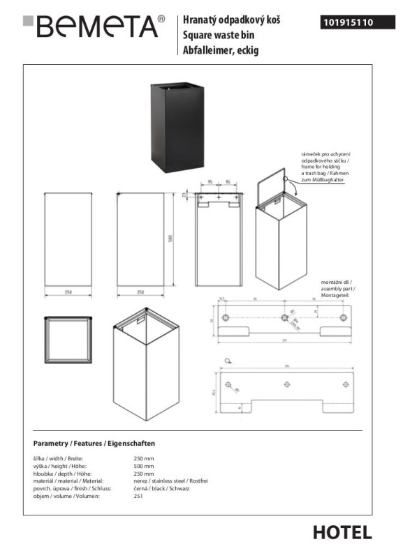 Відро для сміття Bemeta Hotel настінне 25 л нержавіюча сталь чорний мат 101915110