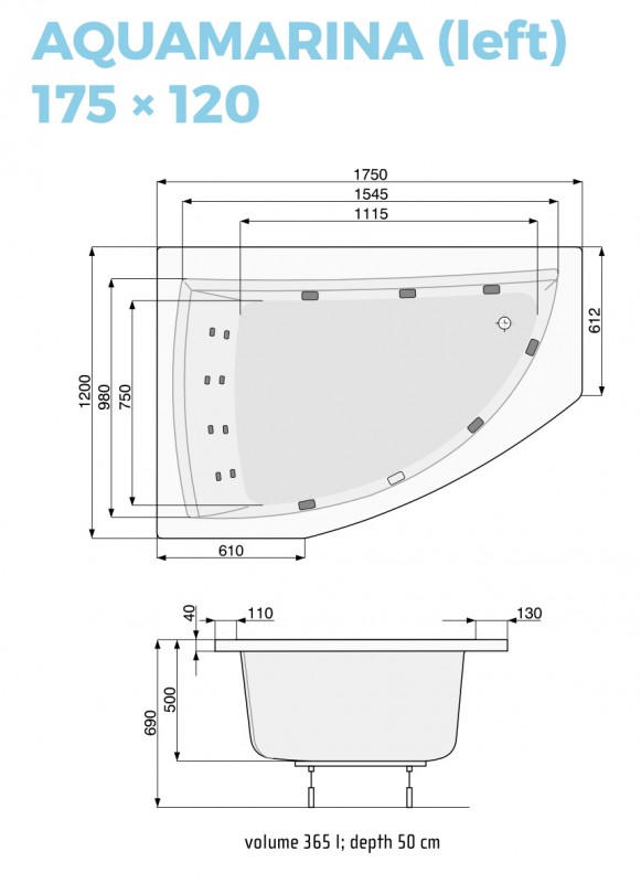 Ванна PoolSpa Aquamarina 175х120 виготовлена з високоякісного санітарного акрилу, армованого скловолокном. Опціонально можна замовити каркас, фронтальну панель і шторку для ванни.