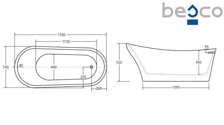 Ванна акрилова Besco Calima 170х74 см із сифоном клік-клак хром глянсовий білий #WAS-170-C