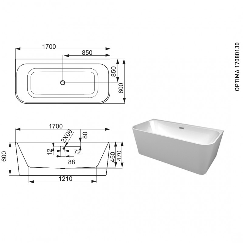 1) Ванна акрилова Devit Optima 170х80 см окремостояча білий
