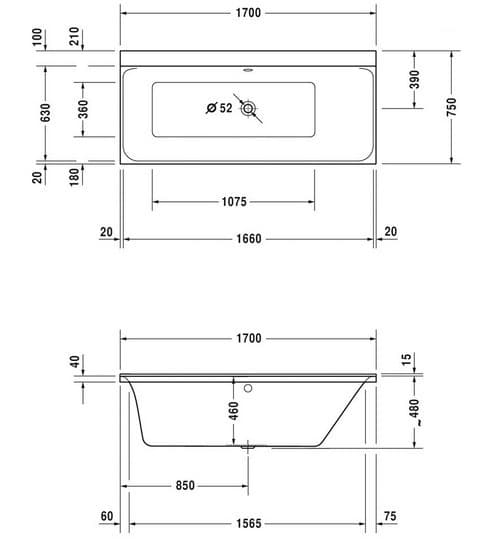 1) Ванна акрилова Duravit P3 Comforts 170х75 см прямокутна білий