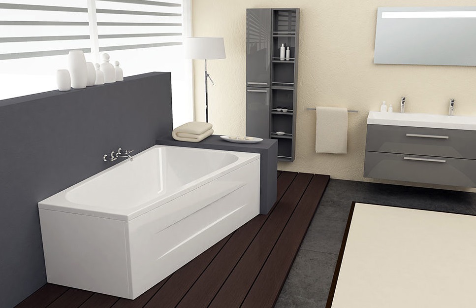 Кутова ванна Beatrice асиметричної форми більш строгого дизайну, в комплекті з фронтальною та бічною панеллю, з масажною системою VITAL+MIKRO (масаж спини).