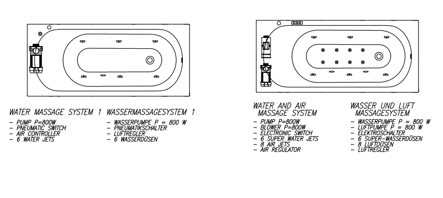 Система гідромасажу працює таким чином: водяний насос створює тиск і приплив води через масажні сопла, які спрямовують струмінь води змішаний з повітрям. Тисяча повітряних кульок з великою швидкістю води інтенсивно масажують людину. Приплив води контролюється відміреним надходженням повітря в масажні форсунки.