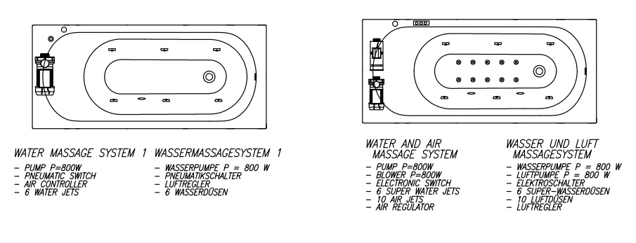 Всі елементи системи водно-повітряного масажу об'єднані у комбіновану систему. Одночасна діяльність обох систем інтенсивно впливає на організм людини, повністю регенерує та розслаблює його. Система аеромасажу працює за рахунок повітряного насоса, що створює підвищений тиск і потік повітря через масажні форсунки. Струмені розбивають повітря на дрібні бульбашки, які змішуються з водою і своєю кінетичною енергією інтенсивно масажують тіло.