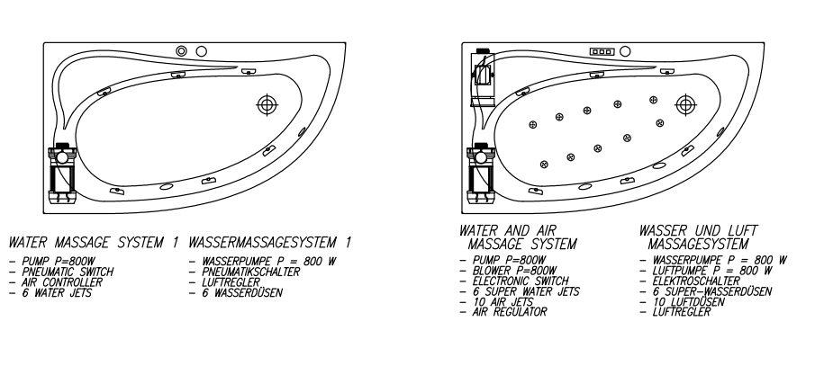 Система гідромасажу працює таким чином: водяний насос створює тиск і приплив води через масажні сопла, які спрямовують струмінь води змішаний з повітрям. Тисяча повітряних кульок з великою швидкістю води інтенсивно масажують людину. Приплив води контролюється відмірянимнадходження повітря в масажні форсунки.